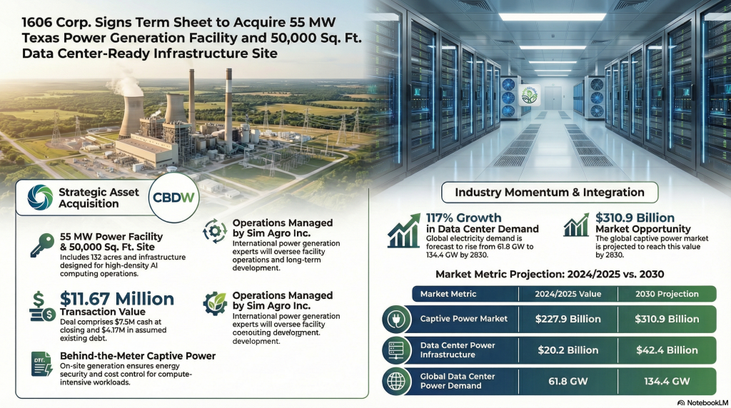 Phoenix, Arizona, February 17, 2026 – PRISM MediaWire (Press Release Service – Press Release Distribution) – 1606 Corp. (OTC: CBDW) (“1606” or the “Company”), a publicly traded Nevada corporation focused on power infrastructure and energy assets supporting artificial intelligence (AI), data center, and industrial demand, today announced that it has entered into a non-binding term sheet to acquire a 55-megawatt (MW) power generation facility and a 50,000 square-foot climate-controlled warehouse in Texas configured for data center operations.