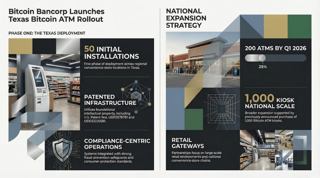 The Company has begun installing the first 50 licensed Bitcoin ATMs, representing the first phase of its previously announced strategy to deploy up to 200 additional crypto ATM machines during the first quarter of 2026. These installations mark the operational start of a broader rollout designed to expand Bitcoin Bancorp’s licensed Bitcoin ATM network across multiple U.S. retail markets.