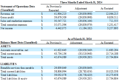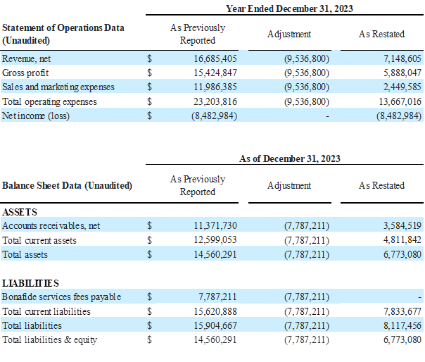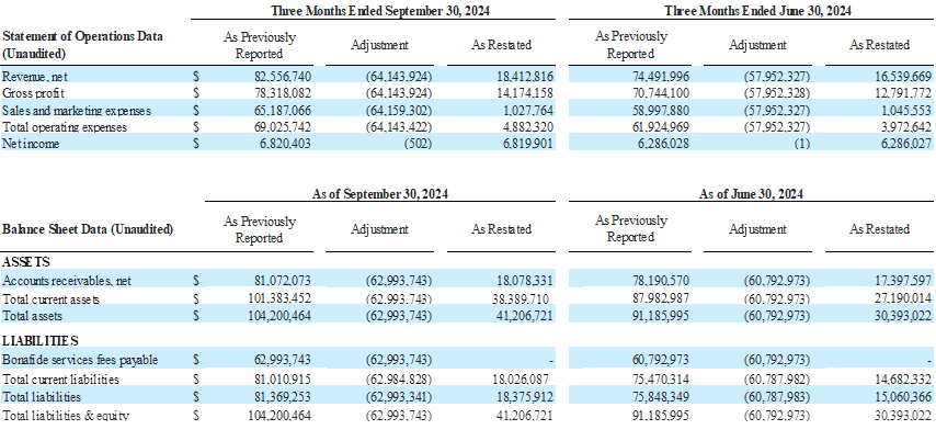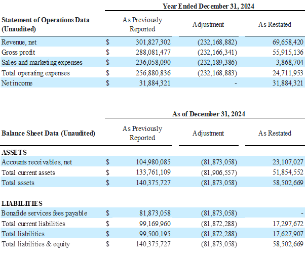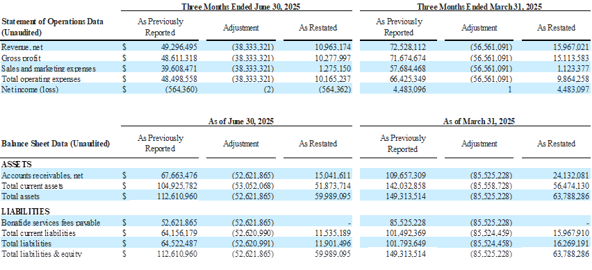 Previously, bona fide services fees were recorded as a Sales and Marketing expense on the consolidated statements of operations. In the restated consolidated statements of operations, and going forward beginning in the third quarter of 2025, these fees are now classified as a contra revenue, meaning they are reported as a reduction of gross revenue to arrive at net revenue.  This change lowers reported revenue and lowers Sales and Marketing expense by the same amount, but does not impact EBITDA, net income, or cash flow. However, because revenue is now reported net, percentage-based metrics such as gross margin and EBITDA margin will look slightly different.