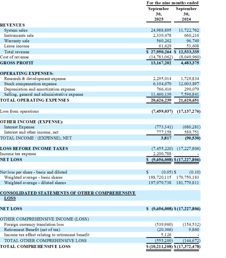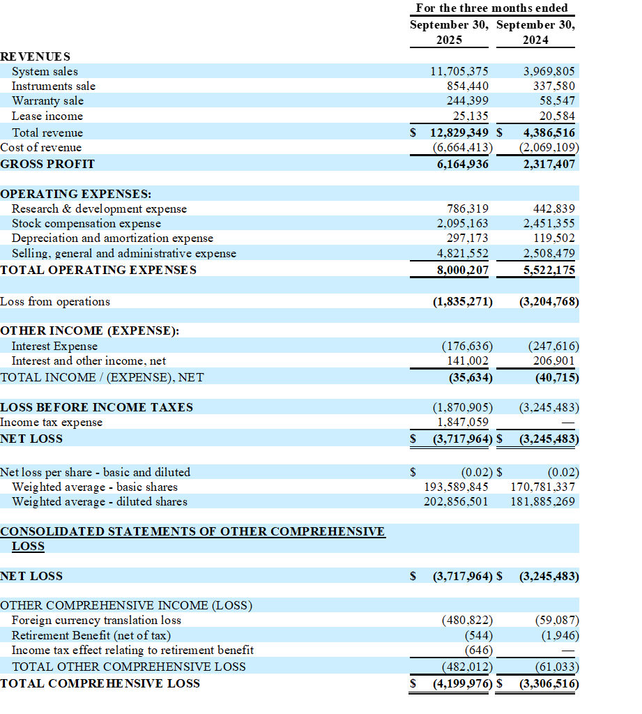 - On September 9, 2025, the Company announced the successful completion of the first robotic telesurgery performed with the SSi Mantra surgical robotic system from the Mantra M mobile robotic telesurgery unit.