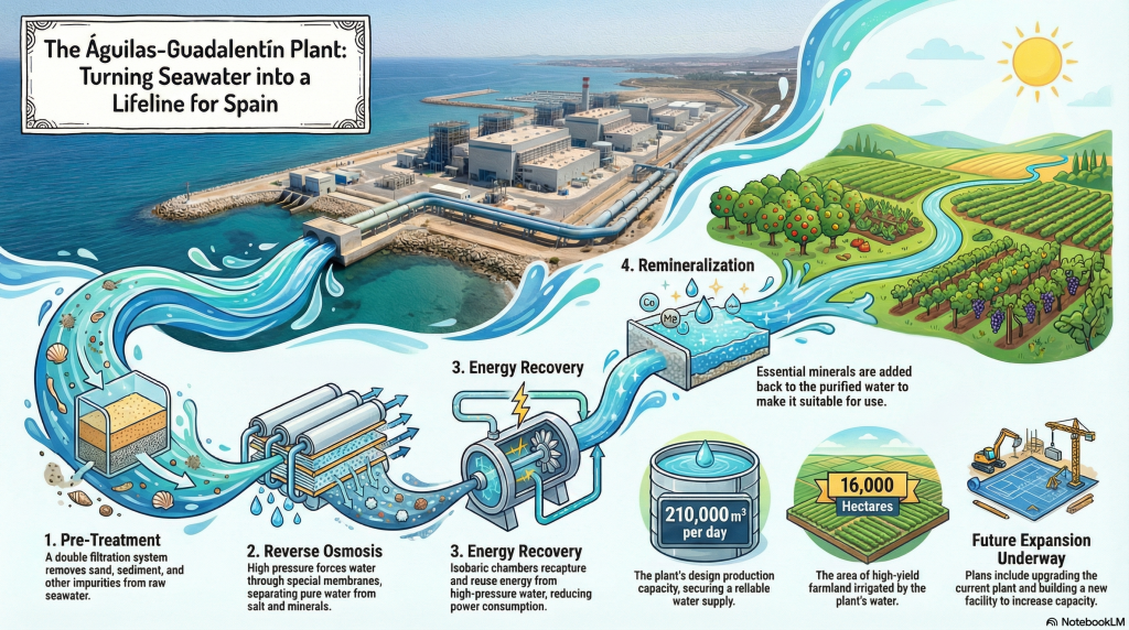 The Águilas–Guadalentín Desalination Plant is located in the region of Murcia and operated by ACUAMED, it is a strategic infrastructure facility ensuring water supply through a high-efficiency reverse osmosis technology for Murcia and southeast Spain. The complex provides desalinated water for irrigation, industry, and urban consumption, reducing pressure on aquifers and strengthening water security in one of Europe’s most important agricultural hubs.
