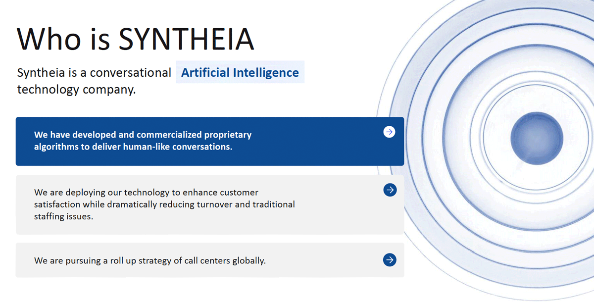 What’s most impressive about the opportunity with Syntheia Corp. is that the company’s technology is proven. When Syntheia was first deployed for a major investor relations firm, it completed 890 client compliance forms in just 3.5 hours…a task previously expected to take two and a half months. During Canada’s last federal election, the platform executed 120,000 outbound calls in two weeks for one of the country’s major political parties. In fact, Syntheia executed those calls so effectively that it was necessary to pause the campaign and slow the system down. Today, Syntheia’s growing client base includes auto dealerships, pharmacies…even the national Olympic Committee.