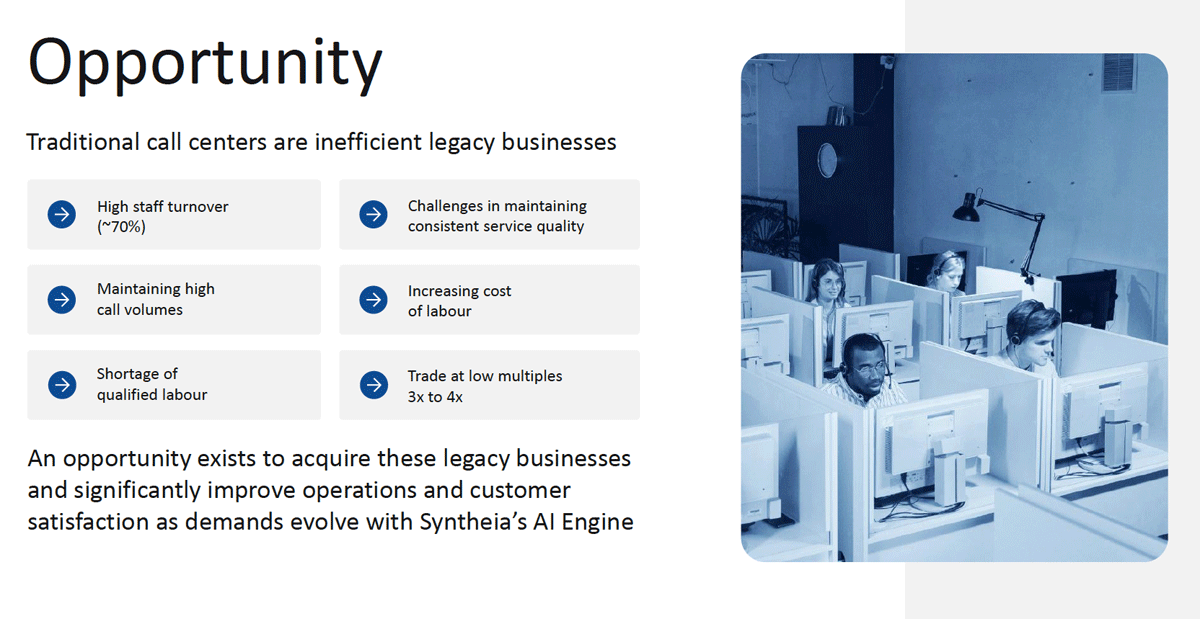 The call center industry hasn’t changed since the 1980s. Most operators are still using a simple setup consisting of a person, a phone and a screen…with no technology strategy and no idea how to build one. Syntheia is acquiring these businesses at attractive prices, then deploying its conversational AI platform to automate routine calls, cut labor costs by up to 30%, and extend operations to 24/7 coverage. Each acquisition instantly adds revenue and EBITDA…and every dollar of AI-driven efficiency goes straight to the Syntheia’s bottom line.