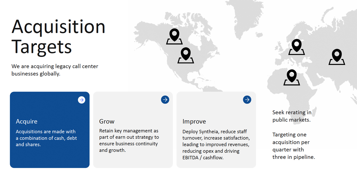 The goal is one acquisition per quarter with each one designed to add scale, revenue, and an operating environment where Syntheia can deploy its AI platform and begin extracting value immediately.