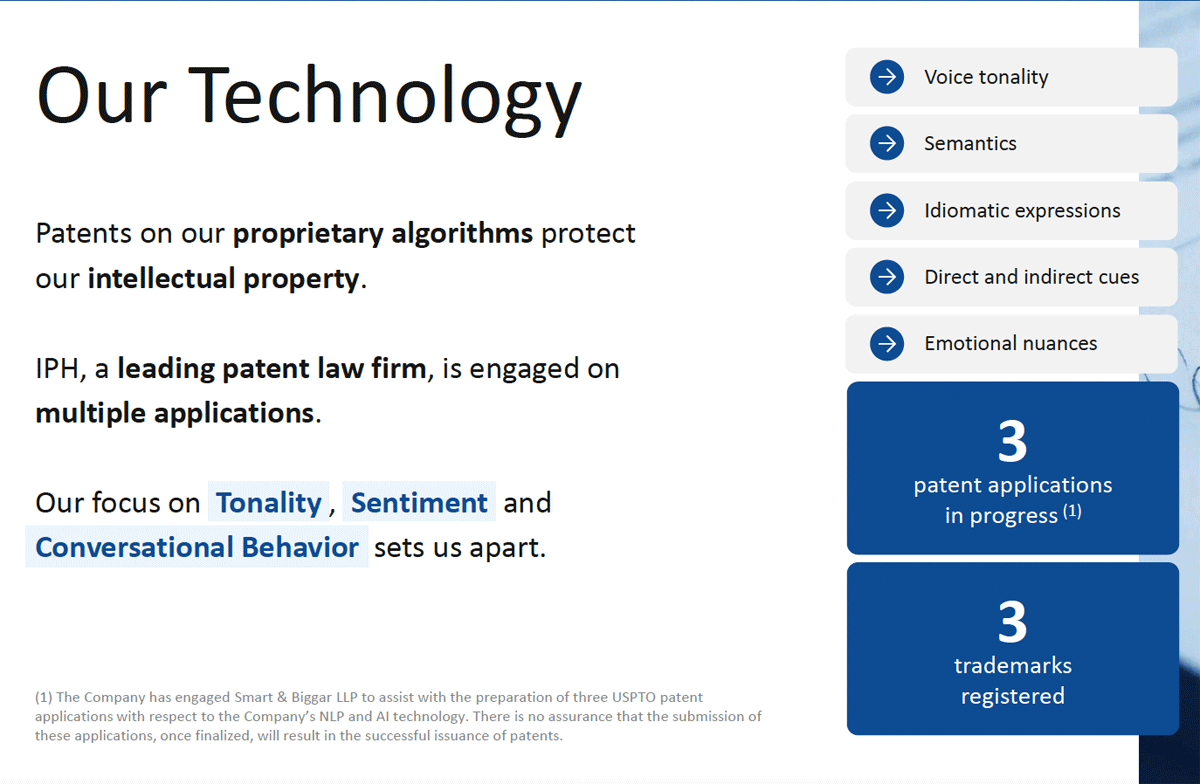 The company has three patent applications in progress protecting its proprietary algorithms, with additional filings expected.