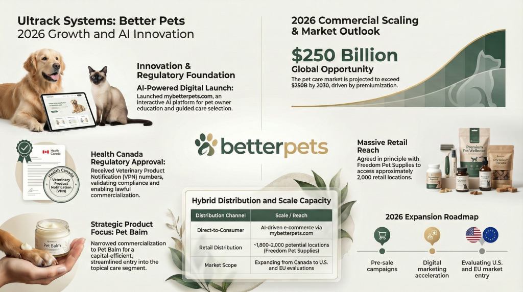 Toronto, Canada, Feb 19, 2026 – PRISM MediaWire (Press Release Service – Press Release Distribution) – Ultrack Systems Inc. (OTC: MJLB) today announced significant progress achieved in 2025 by its wholly owned subsidiary, Better Pets, highlighting a series of regulatory, branding, commercialization, and digital transformation milestones that position the company for expansion in 2026 amid continued growth in the global pet wellness industry.