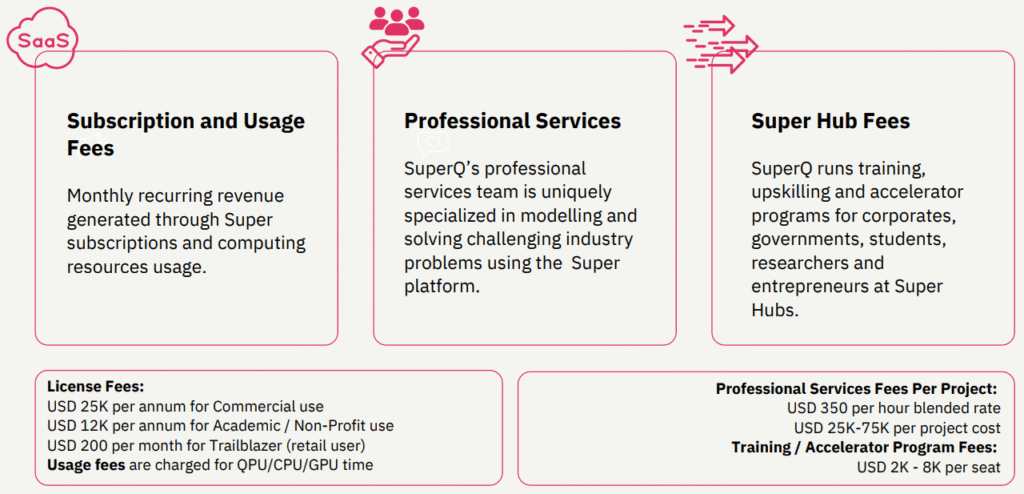 SuperQ doesn’t rely on a single business model. The company generates revenue through: (1) SaaS subscriptions to its Super™ platform, (2) high-value professional services projects (available for $200K-$300K each), and (3) training programs through its Super Hubs. This diversified revenue model reduces risk and provides multiple paths to growth as the quantum computing market expands. If one channel slows, two others keep driving revenue.