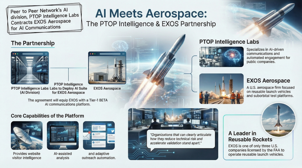 Under the agreement, PTOP Intelligence Labs will deploy its proprietary identification and automation code on the EXOS Aerospace website and configure a multi-layer communications stack designed to support and automate select communications workflows. The Tier-1 service module includes website visitor intelligence, AI-assisted analysis tools, and adaptive sequenced outreach capabilities intended to help EXOS Aerospace communicate complex technical value propositions clearly and efficiently to investors, partners, and government stakeholders.