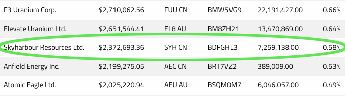Catalyst-Rich Company and Institutional Accumulation: Skyharbour is fully funded for the upcoming drill programs at its co-flagship Russell Lake and Moore Uranium Projects in 2026 totaling approx. 30,000 meters of combined drilling, representing one of the largest annual drill campaign ever carried out by the Company. Other partner companies are planning additional exploration and drilling programs across several of Skyharbour’s secondary projects as part of its growing prospect generator strategy. Under this model, partners fund exploration activities while providing Skyharbour with annual cash and share payments, allowing the Company to advance its broader portfolio in a non-dilutive manner. Institutions are piling in and have been accumulating millions of shares of Skyharbour. The Sprott URNJ ETF owns around 7,259,138 shares and Global X ETF is sitting on about 12,839,610 shares as of 04/06/2026.(24)(25)