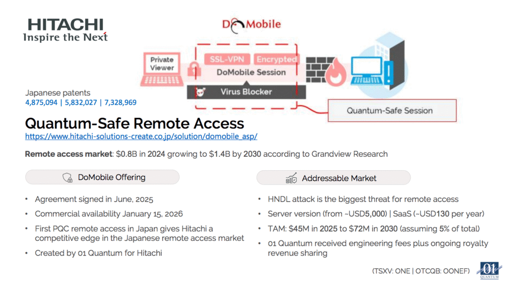 Hitachi Solutions Create Ltd. (HSC) selected 01 Quantum to provide quantum-safe technology for their DoMobile Ver. 5 remote access platform and when it launches in January 2026 it will become the first PQC remote access solution in Japan. The business model calls for 01 Quantum to receive engineering fees upfront plus ongoing royalty revenue sharing, with bookings already in place ahead of the commercial launch. The Japanese remote access market is projected to grow from $800 million to $1.4 billion by 2030, and organizations handling sensitive data need quantum-safe protection now. HSC is set to deliver it with 01 Quantum’s technology inside, protected by three Japanese patents.