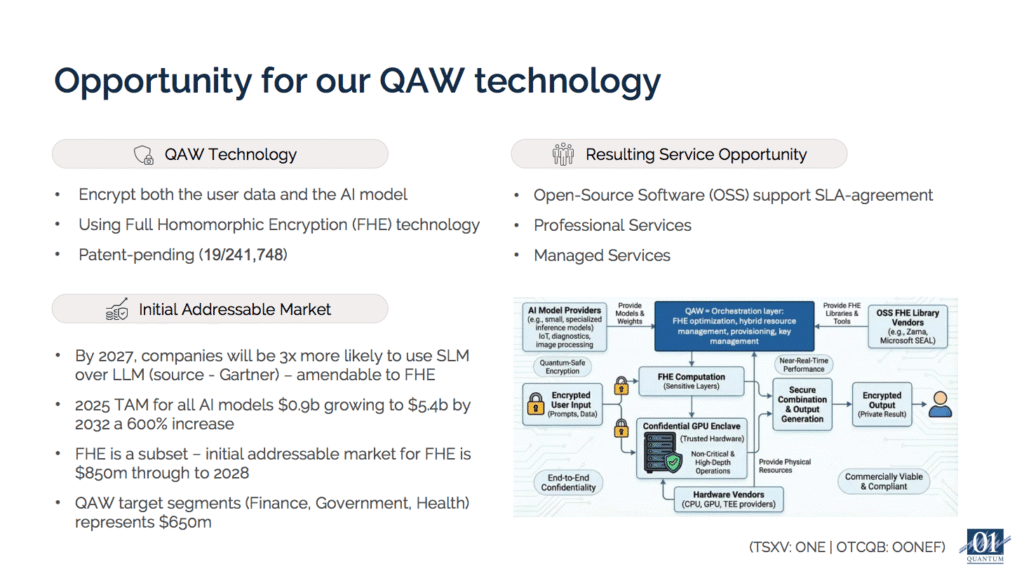 AI has a pressing security problem: AI models today are vulnerable to privacy breaches and intellectual property theft, pre and post Q-Day, which means users won’t feed sensitive data to AI models they can’t trust, model owners won’t expose proprietary data sets, and regulated industries face compliance barriers that limit adoption. 01 Quantum’s patent pending QAW (Quantum AI Wrapper) solves this using Full Homomorphic Encryption, keeping both user data and AI models encrypted during the entire inference process so nothing is ever exposed. The business model is a quantum-safe AI marketplace with 15-25% commissions plus professional services revenue, targeting a $650 million initial addressable market across finance, government, and healthcare. Commercial availability is planned in stages through 2027 with the initial release scheduled for Q2 2026.