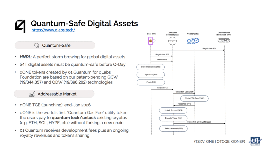 Every major cryptocurrency relies on elliptic-curve encryption that quantum computers are expected to break, putting roughly $4 trillion in digital assets at risk when Q-Day arrives. 01 Quantum’s patent-pending Quantum Crypto Wrapper (QCW) and Quantum DeFi Wrapper (QDW) technologies enable quantum-safe transactions on existing cryptocurrencies without requiring blockchain overhauls, meaning users can quantum-lock holdings without forking to a new chain. Through its qLabs partnership, 01 Quantum created qONE tokens, the world’s first quantum safe token and wallet on Hyperliquid, set to launch early February 2026. Following this, in the March/April timeframe is the anticipated release of the world’s first “Quantum Gas Fee” utility where users pay qONE to quantum-lock their crypto on Hyperliquid (HYPE), Ethereum (ETH), Solana (SOL), and other chains. Revenue flows to 01 Quantum through development fees upfront plus ongoing royalty and token sharing.