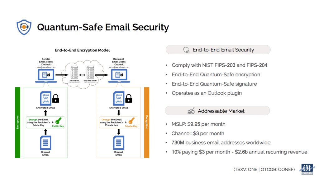 Right now, hackers are capturing encrypted emails with plans to decrypt them later, referred to as harvest now decrypt later (HNDL) once quantum computers are capable of breaking today’s encryption, exposing years of sensitive communications. 01 Quantum’s IronCAP X™ provides end-to-end quantum-safe encryption that quantum computers cannot break, and it’s commercially available to generate subscription revenue now. With 730 million business email accounts worldwide, even modest adoption at the channel price represents a multi-billion dollar annual market opportunity.