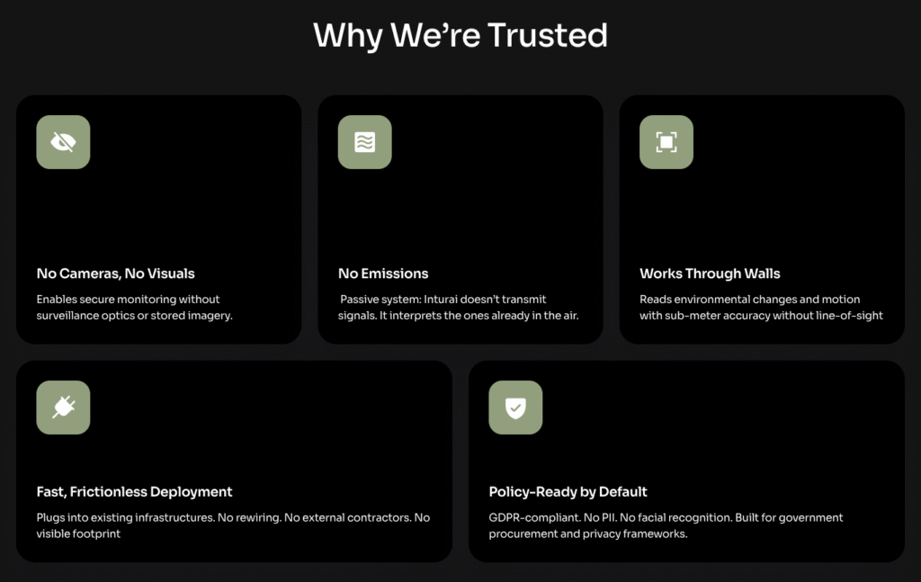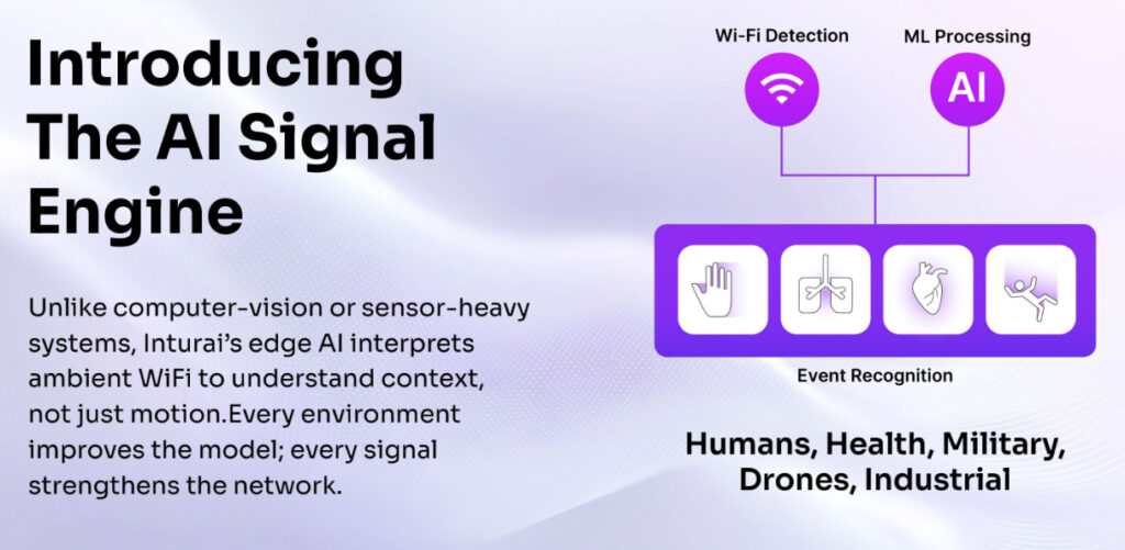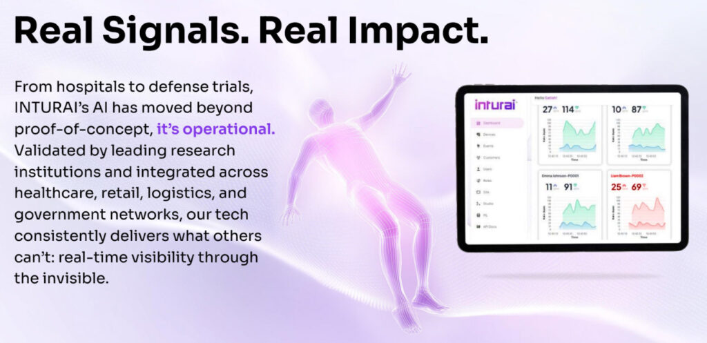 Inturai’s edge AI reads the way wireless signals distort when they pass through a human body, and translates those distortions into real-time intelligence: Is someone in that room? How many people? Are they moving? Breathing normally? Asleep?