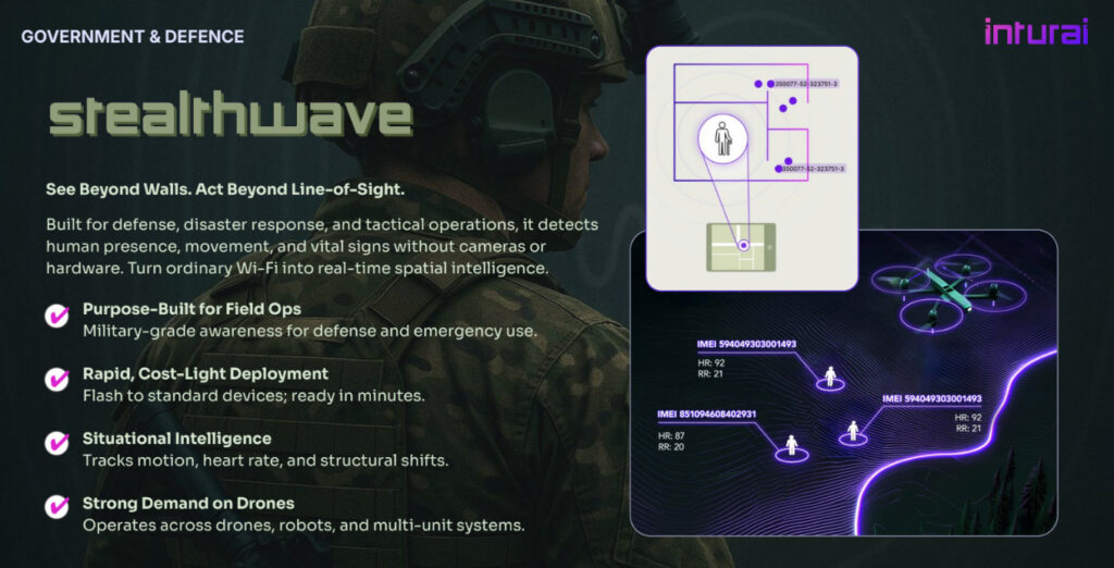 Unlike thermal imaging or radar-based systems that announce their presence and require dedicated infrastructure, Stealthwave runs silently on hardware that’s already in place. The moment Inturai’s software is deployed in any WiFi-enabled environment, that space becomes a real-time human detection system. It reads movement, presence and vital signs through walls and ceilings without leaving a visible trace or requiring a single piece of specialized equipment.