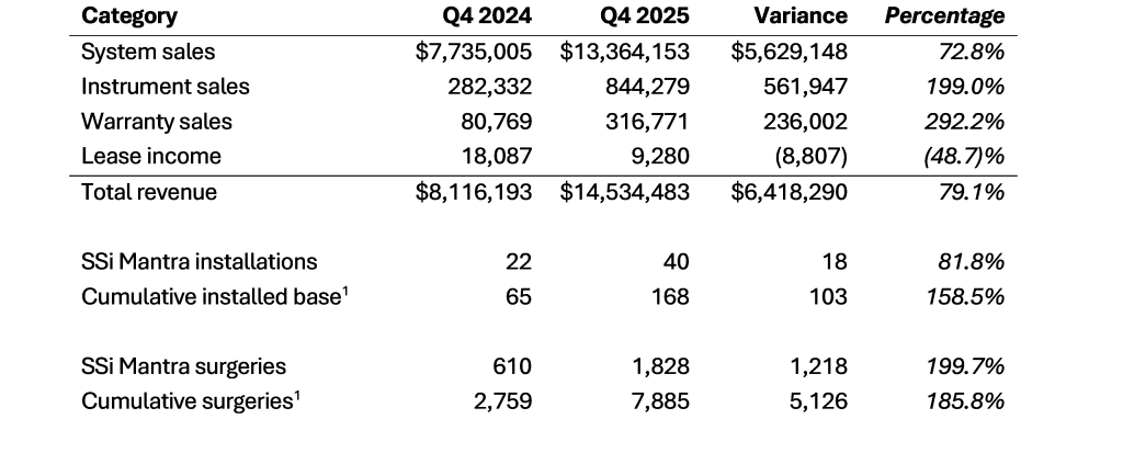 - SSi Mantra surgical robotic system installations totaled 40, up 81.8% from 22 installations in the fourth quarter of 2024 and up 48.1% from 27 installations in the third quarter of 2025.