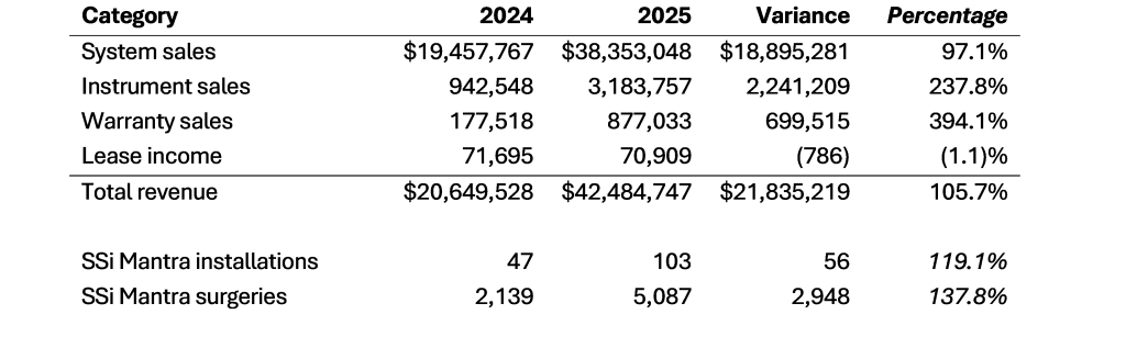 - SSi Mantra surgical robotic system installations totaled 103, up 119.1% from 47 installations in 2024.